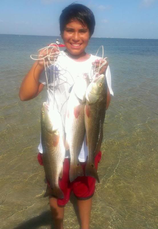 Took Shrimp to Honey Hole with nothing but the Malabou II and 1/4 oz gold johnson sprites. Got there at 6:45 a.m. and started to wade, of course i was pulling him on the yak cause he only 4 ft 8. Those of you who know the freak, know i like to wade shoulder high. We managed to luck out and catch these fish, with Shrimp Limiting on reds for the first time in his short fishing career. He was on cloud nine and so was i. Had beer battered Reds last night and you talk about good, damn..