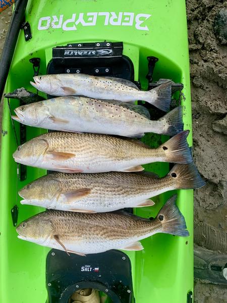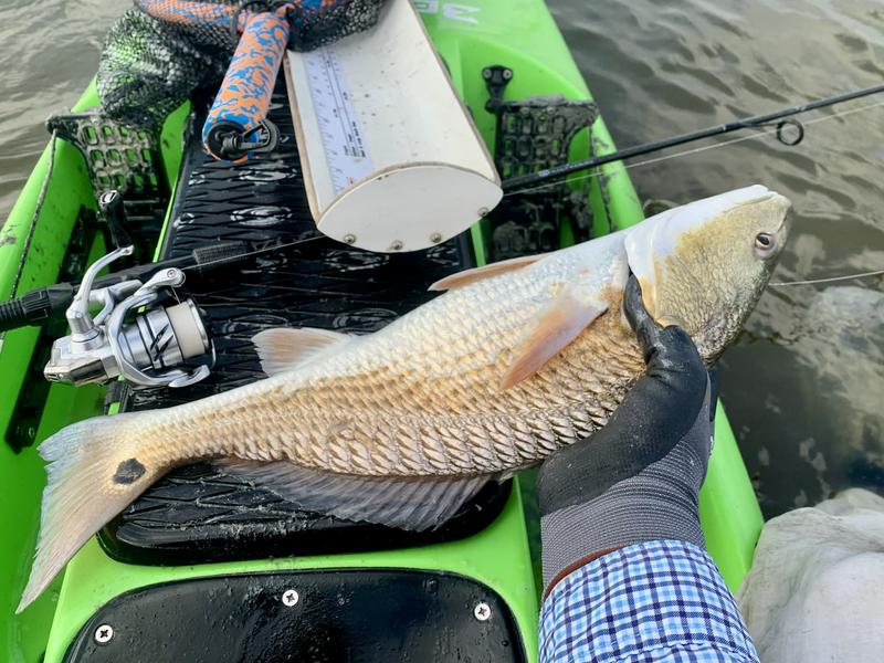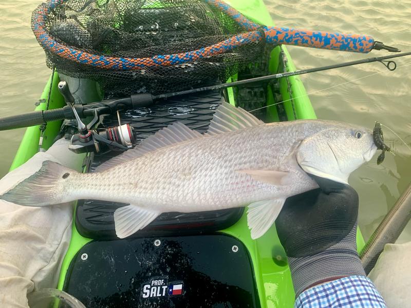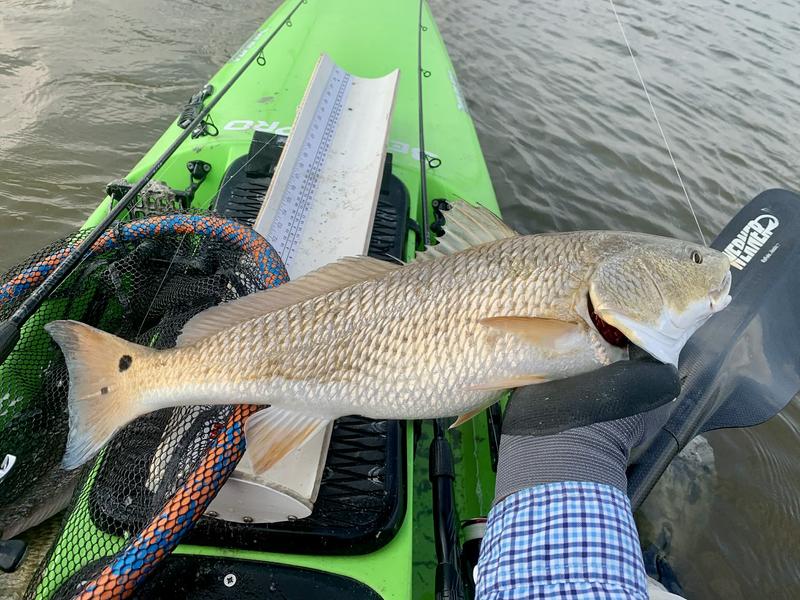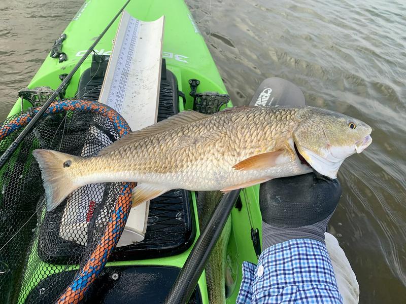 The shorelines were shallow but did have a few singles feeding up shallow. They were spooky and didn't tolerate an approach that was too quick, or a bait landing too close to them. Because of this I blew it on a couple of fish, but I adjusted and got serious. The next fish was visible crawling in and out near some grass, and I closed the distance slowly. The bait landed about five feet from the fish and I waited for it to move closer before I moved the lure. I was barely moving the lure, just slowly dragging it through the mud an inch at a time. This worked, and at first the fish turned toward it and stopped. After a few seconds I slowly crept it forward a couple more inches, and the fish closed the distance about six inches. Everyone stopped for a second and I watched the fish, more tense now and really concentrating on my bait. One more slow inch forward and the fish pounced. The tactile "thump" felt good and I set the hook, which sadly sent the bait over my head and behind the kayak. The fish bolted ahead in the confusion and ran head-first into the side of the kayak before running off into deeper water. The fish was lower slot, so I didn't mind too much. I noticed 20 yards farther up was another fish. It looked about the same size, but I closed in to play a second round. This time the cast was directly ahead of the fish, so I slowly kept the bait coming back toward the fish. It ate successfully and we were hooked up. This was a healthy but faded looking fish that measured 21" so I put it back to grow. I paddled all the shorelines in the squares without hooking another red. Then I went into the channel leading to the bay. Water was running from the flats into the channel, and I heard a couple of trout slurps as they chased bait in that moving water. So I put a couple of paddle tails behind the kayak and paddled the areas where water was mixing. Of the three trout I caught, one was 14, one was 16 and one was right at 20 and really chunky. I kept the two legal fish and headed back to the river. I decided to head upriver away from the truck for a bit to see if one more trout would volunteer to ride home, but didn't get any takers. What I did get was a pair of gulls that quickly dropped down beside the shore and then left again. I looked at the water closer. Through the chop I could see shrimp jumping and a couple of redfish tails. This is unusual in the river, but I was happy to capitalize on the opportunity. I got close and tossed one of the paddle tails ahead of the fish. The line went tight immediately, and I brought in a 21" pumpkin. The others continued along the shore, so I netted the fish and left him in the net as I reached for the other rod. Another cast landed beside the fish and again was immediately eaten. This fish was 22 and I got both into the net. I quickly unhooked one of the fish and paddled a bit closer to the still moving school. I got the bait several feet ahead of the reds and brought it closer. This time it got smashed with lots of foam and noise, and it busted up the school. That would be okay if the fish stayed hooked, because I suddenly had a limit of reds. After that I trolled the paddle tails back to the truck without any more trout strikes. Not a bad morning considering the challenges!