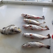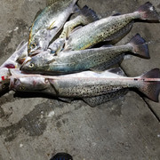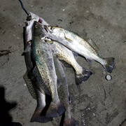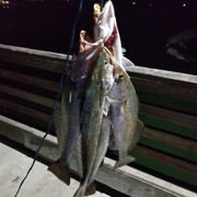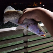 So Caldwell Pier and I have a real mixed history of getting skunked and getting my limit and thankfully I got my limit that night. Less than 15 people on the pier and more than enough fish to go around. I saw atleast 7 people limit out on nice 17 inch trouts for a good 3 hours from 1am to 4am. Massive schools of undersized reds were in the first gut and after the halfway point of the pier large schools of trouts were slapping the top. Trouts mixed in with atlantic bumpers and every so often you would see a random shark skulk near the outsides of the lights. There were swells but since it was so far down the pier their were not so bad. Free lining and light jig heads with shrimp or tandem speck rigs were the ticket. No point fishing the bottom cause nothing were there.