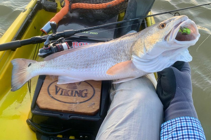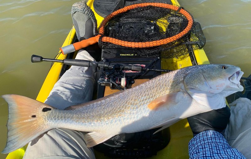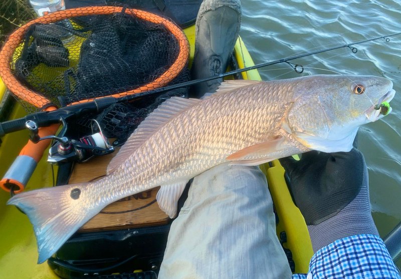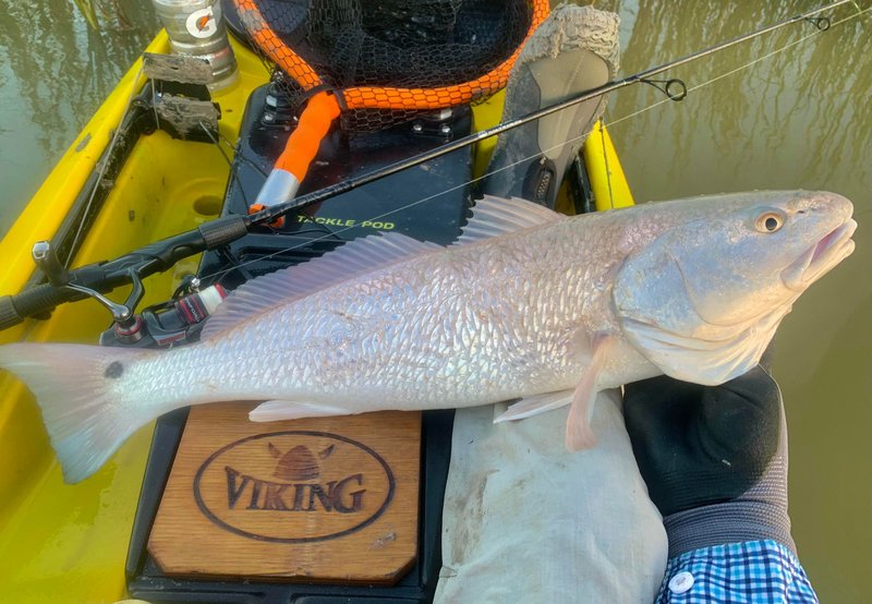 With a cool front scheduled to pass through late Friday night, I opted to fish Friday afternoon rather than playing in the North wind Saturday. High tide in Nueces Bay had been early morning and I hoped it would be rushing out and giving me an easy time spotting fish. What I got instead was a good breeze and higher water than I planned on. The tide was slowly dropping, but the levels were high even after lunch. Not one to complain, I set out just after lunch to find some fish. Since it would be several hours before the projected heavy feed, I went ahead and paddled North across most of the marsh, watching shores carefully as I went. Redfish are a lot like college aged guys. There are always a few up and looking for a snack, even when it's not meal time. A mile and a half into the marsh I found a few frat brothers poking through the grass. I eased quietly to within 15' and it only took one cast to hook a good fish. The bait was eaten by an unseen fish beside my target, who had been cruising just out of view in the murk. He was a good one at nearly 27". Once that guy was in the bag I kept paddling and it was nearly three more hours before I spotted the next group. The sun was beginning to get low in the sky and on a string of islands beside a drainage I found what looked like four fish quietly moving along. Most of the time there were no signs of their presence, but as I was passing that shoreline one got close to the surface and made a wake long enough to draw my attention. I couldn't see them, but when shrimp jumped out of the water I knew where to cast. The line came tight and number two came aboard. I began to work back toward the truck and came around a corner to see a group working along ahead of me. I caught up and got beside them before casting. Yep, these were hungry too, and I had a limit on board. I was enjoying the exercise as I made my way back, and as I eased down the last shoreline before the portage site, I noticed a small bulge in the water followed by a shrimp jumping. I flicked the bait out and eased it back towards me and the fish hit hard. Once the bonus fish was released I stowed the lines and just paddled to get back before dark. I hadn't brought the all around light, and didn't want to find out if any motorboats would be in the river once it got dark. It all worked out and I got to the truck 10 minutes before dark, having paddled 11 miles. Now I wouldn't feel bad about doing other chores on Saturday while the North wind blew.