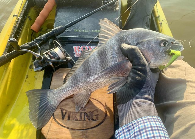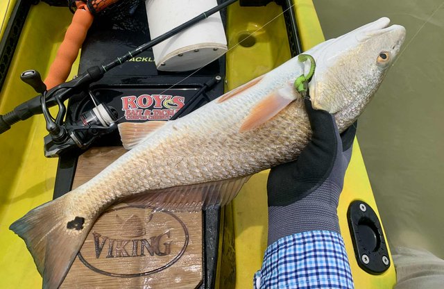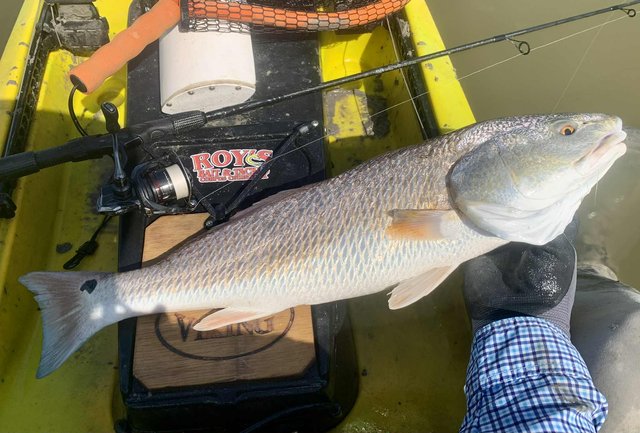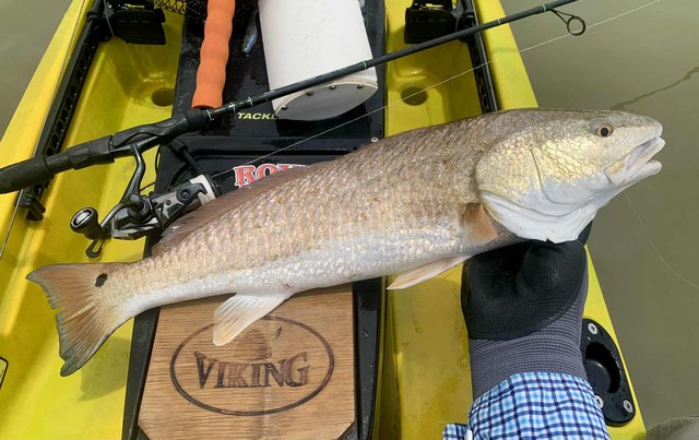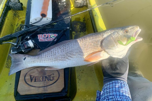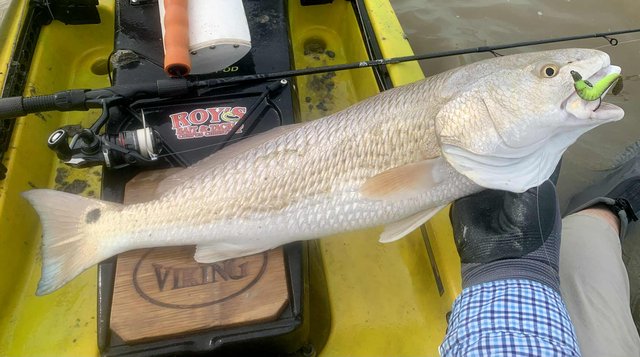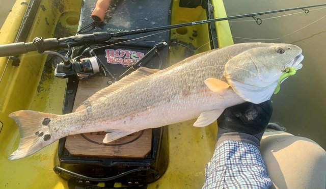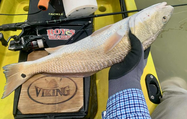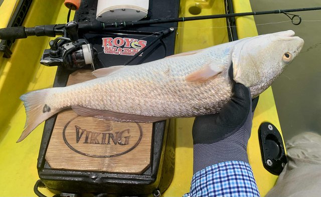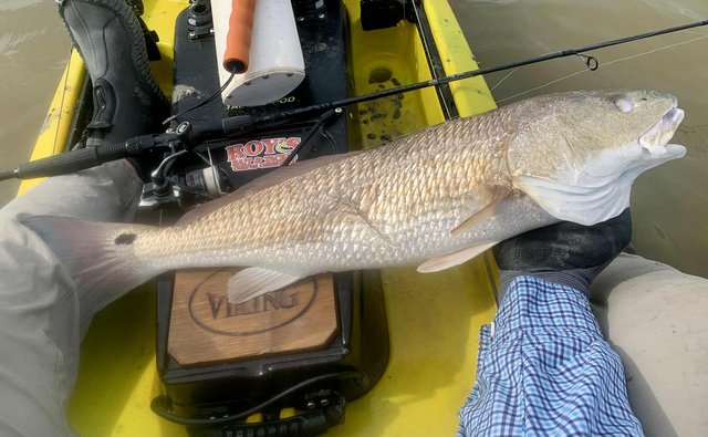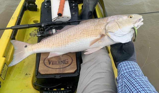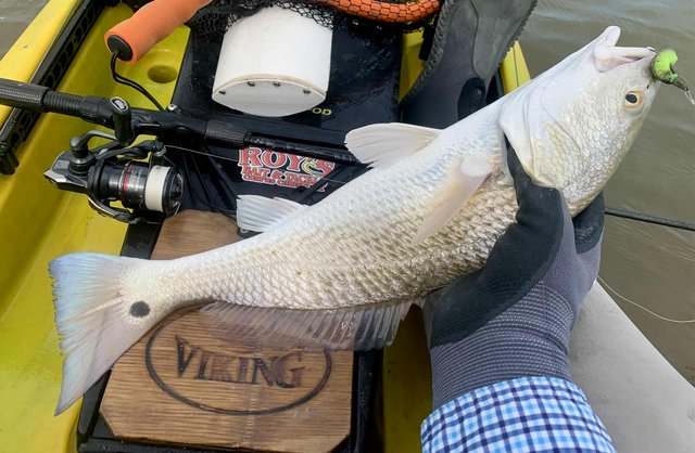 Friday after work I knew conditions would be good for fishing, so I loaded the gear and kayak before heading to the college. Del Mar closes at 12:30 on Fridays so at mid-day I headed for the water. To my surprise, nobody else was on the water or parked at the launch, and I happily scooted over to the protected shoreline. Within a few minutes I noticed a school of tailers up ahead. Their dark tails were waving in the flooded grass, and with high tide levels I was able to float above the tops of the oyster clumps that usually ground the kayak. I got within range and pitched a 1/10 ounce jig just ahead of the fish. A gentle hookset and steering the fish with rod tip held low allowed me to steer the fish into open water before a firmer hookset and the noise and splashing that comes with it. The school continued on as I kept a foot in the mud to keep the fish from rejoining and breaking up the school. I snapped a photo of the 22" fish and released it, hoping for larger ones. As I caught up to the group, I did the same thing over again, and to my surprise the fish cooperated and came out of the grass before making a commotion. After a couple of seconds the school resumed feeding as I worked my fish to the net. Another low slot fish was released and I prepared to try it one more time. This time the fish were working more quietly with only a few visible tails showing. They were becoming aware that something might be amiss, but were still approachable. I placed the bait up in the grass and eased it into the water just ahead of one red. He hit it hard and splashed right through the other fish getting into open water, wo the group looked to break up. Oh well, I got the fish aboard for a quick photo before turning it loose. Another 21" fish. I figured I had seen the last of that school, so I continued along the shoreline. As I rounded a small corner, there was my school again feeding visibly. It took three casts to hit the mark, because the wind temporarily was blowing - but once I got the bait where it needed to be, the line went tight again. This fish was 23" but still not what I was hoping for. The school got back together ahead of me, but I paddled around them to look for larger fish. I got down the shore to the turn-in to the back lake, and headed that way to see what fish were back there. With higher tides it was easy getting through the (normally) very shallow areas. When I got to the lake there were several schools of fish marauding around. I couldn't see tails, but the wakes were hard to miss as groups of larger fish crisscrossed the lake looking for snacks. I managed to place the kayak ahead of several groups, and although a few fish were overslot, I did land 27 and 28 inch fish that went into the bag. Before I left the lake I decided to check a shoreline that was usually too shallow to sneak around in, but with additional water it was good for taking a look. As I eased along the shore, I spotted a big bronze back. At first I wondered why someone had placed a big dead redfish against the shoreline like that. It was VERY shallow and mostly out of the water and the situation of a fish out of water didn't look very convincing. But then the fish moved and slowly continued to hunt against the grass. Huh, I guess it's just a fish that doesn't need that much water to breathe, lol. Over the next minute or two I made multiple casts, trying to get the attention of the fish. He was so out of the water I couldn't get noticed if I placed the lure deeper, and there was not much room to get his attention in front either. Finally I got the fish to turn toward the kayak. He wasn't spooked at all, but was looking for the tiny disturbance that might mean a meal. The next cast I made landed beside the fish on the side that had been facing the grass, and as the lure hit the water it was met with violence. I fought the fish for a couple of minutes in the shallows and all around the boat. When it finally came to the net I realized why it hadn't seen the lure multiple times. At some point in the distant past, this fish had lost its right eye. When it was so shallow that the lateral line was above the water, it had no idea I was offering it a lure on that side until I finally got it to turn towards the boat. Although I felt bad for the fish and it was obviously not missing many meals, I kept this 27.5 incher to complete the limit. After that I headed back toward the launch to try for a few trout closer to the launch area. I managed a dozen specks, but only one was a legal keeper.
