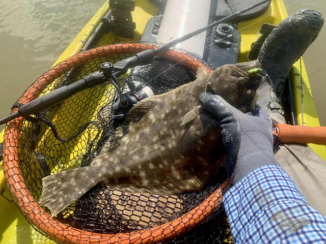 The next morning I had planned to sleep in, but with the Friday success I decided to just leave the gear in the truck and do it again. When I arrived at the launch Saturday morning there wasn't anyone there yet, so I launched quickly before others showed up. I got around the corner and began to work toward a different shoreline since the small front had come through overnight. With a light North wind I was able to run shorelines that I had not visited in a while, and tide level was low and offered a new look. I made a little one mile loop, catching a low slot trout that had slurped a bait on the surface near me. I put the bait right on the bubbles, and the trout ate. Things were slow for now, so I decided to return to the lake to get a look while winds were down. Tides were now low as well, so getting through some parts of the journey take some work, but I slide that kayak through a lot of mud sometimes and off I went. As I rounded a corner in one small shallow lake, I realized that there was a seven foot gator that appeared to be sleeping out in the middle. Water was about an inch deep out there, and as I quietly worked past along the deeper edge, the gator just layed there unbothered. The early sun was lighting her up nicely, and the colors were beautiful. I continued through the mud, and before I left that lake I looked back to be sure of where she was. The gator was completely gone, and I hoped she had moved up into the grasses and wouldn't be around as I came back out. The rest of the journey to the lake was uneventful with no feeding fish in the channel, but the lake had (as always) some fish moving around. I pushed through the shallow mud toward one group, and lucky for me, they turned my way. I just stopped and waited as they closed the distance. When they got close, they turned to pass at 10 yards and it made for a very easy cast. The take was immediate, and the fish splashed and made enough noise to break up all other visible activity. After a few long runs, I was able to net a lovely 27" red that went right into the bag. I spent a few minutes crawling back and forth, searching for more active fish and finally I found a couple of small groups about a hundred yards away. A long slow approach got the kayak within casting range, and I began to notice backs poking above the surface - these were puppy drum. So I put the bait ahead of one of the fish that was swimming and not nosing into the mud, and he ate. Black drum won't always eat a bait, but this one did and allowed me to add a third species to today's list. I had a sight-casted slam! I got back to the open water to work the shoreline again that was out of the wind, and I found a nice school of solid fish working the grass. I only got one out of the group, but it was a nice 26" fish that went into the bag to join the trout, red and drum. After that it was three hours of careful and quiet searching with not much to show, except for a group of feeding specks I noticed in the open water. I paddled out and caught 12 more small trout. Since these were all small I went back to my shoreline to find the missing red. Near mid-day I decided to take a long skinny channel back towards the truck. It didn't have any signs of feeding fish either, until I got near the end. I noticed a clump of grass right at the end of the channel, and something ran out of the grass and attacked some baitfish and making a commotion. It was still a hundred yards away but it had my attention. As I moved slowly towards that spot, I noticed a redfish swimming against the shoreline. It wasn't even leaving a wake, but with the angle of the sun I could see it below the surface. A carefully placed cast put the bait where the fish could see it and the line came tight. At nearly 27" I had a limit of reds and was happy to head back to the truck ...after I checked that last clump of grass. As I got close something began to leave a very faint wake as it moved back to the grass. I put the lure right on the grass edge and began to come back towards the wake. The fish ate and immediately jumped out of the water. It was a nice flounder, and I got serious trying to hurry it to the net. I have lost a lot of flounder during fights, and I wanted this one. After a few failed attempts I got the fish into the net and in the boat. Cool, I had sight casted a super-slam! After carefully getting the flounder into the bag it was time to head for the truck and some lunch. After yesterday's 10 miles and today's 12 miles I was ready for lunch and a nap.