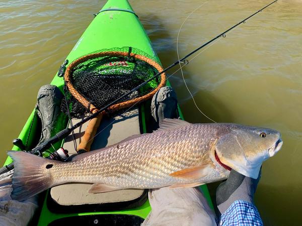 …and all across the flats I expected silence. What I got was several mud boats exploring every back lake for potential hunt locations. Every inch of shorelines got burned at least once through the afternoon, so conditions for fishing were tough. Nervous fish didn’t get up to eat much, but I kept looking, determined that despite the challenges there would be a fish or two willing to bite. In one connecting channel I spotted a back out of the water from 300 yards. I continued in that direction hoping a boat wouldn’t suddenly appear and take away the only chance I had seen. Thankfully it stayed quiet for long enough to get to the location. When I spotted the fish it was swimming towards me in four inches of water. I waited for it to get within 20 feet before gently laying the bait just beyond its path. A slow retrieve was all that was needed, and the fish thumped the bait hard. It barely took any drag, and I guessed it might be a lower slot fish, but when I scooped it into the net, the fish suddenly realized the danger and started really fighting. But it was too late. After several attempts I got a hand on the gills of the fish for a photo, and at 27.5” it was put right into the box. Once in, the fish spent the next 15 minutes playing the bass drum from within the kayak. It was okay because within five minutes my buddies in the mud boat came roaring through on their way to explore the last few options I had available. I got to re-live my old visits to NASCAR races as the boat, running straight pipes and making more noise than a Space-X rocket went by. I did my best to find another fish that wasn’t scared witless, to no avail. By sunset I had paddled 10.5 miles and explored a lot of water, but at least I was able to find one relaxed fish.