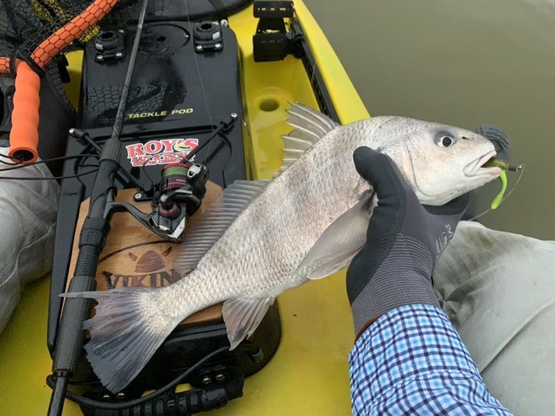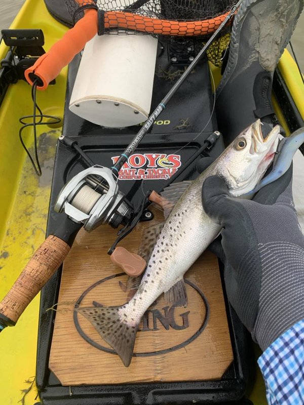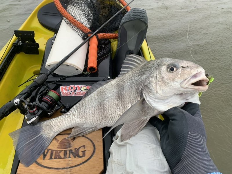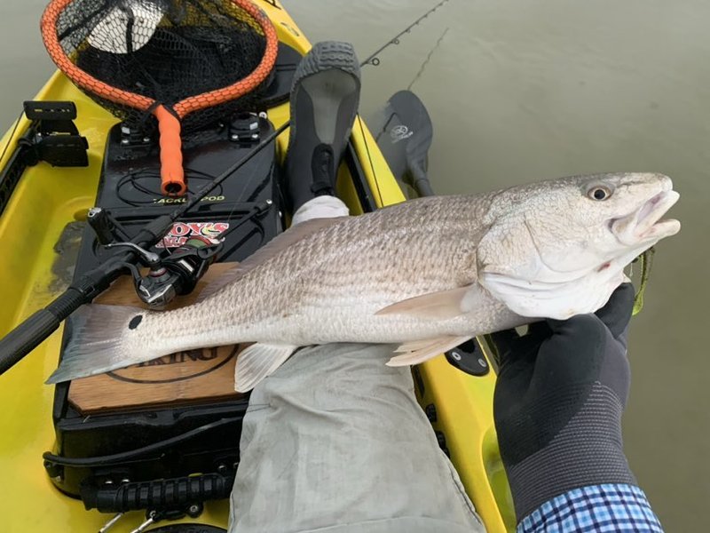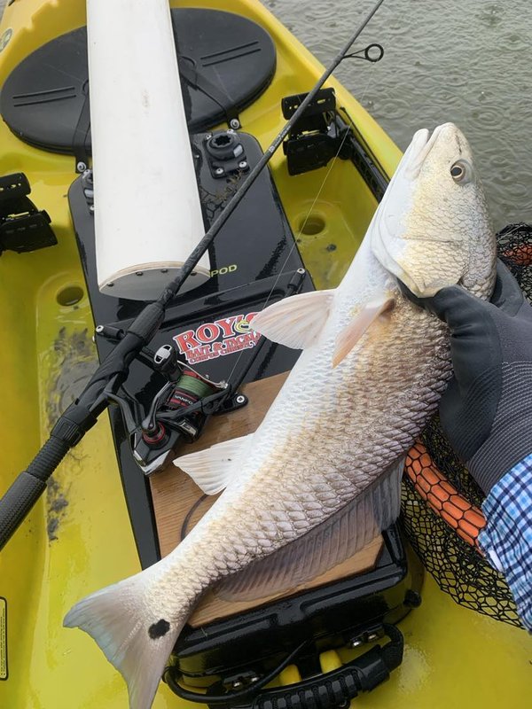 Saturday morning rain was forecast, but lightning wasn't showing until afternoon so I returned to play some more. The low tide wasn't as low, and my flat was covered in 6-8" of water which can make finding my targets difficult from a sitting position on the kayak. I spent a while approaching a 26" fish that was crawling along like a neon sign, and after catching that fish it began to rain. I wasn't sure if the fish would continue to hunt in the rain or not, but to my surprise it seemed to bring on a more active bite. I left the shorelines and headed towards the middle of the lake where lots of gray herons were wading. Many were walking along watching the water, and I knew that they were shadowing redfish. What followed was two hours of madness that was near the top of my list for flats trips. Big individual fish were hunting, with just enough backs visible to make it fun. The rain provided enough cover sounds to help me sneak in close and that was enough to provide constant action. By 9:30 I had caught 19 reds and five drum with every fish sighted, stalked and hooked. On the way back to the truck I stopped at a drain where water was rushing back onto the flat. I saw a trout busting shad near one corner, and a careful cast of the Z-man paddle tail gave me a small trout for three species landed. I didn't see another soul on the water until I was approaching the truck. What a glorious morning!
