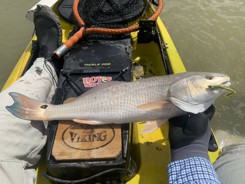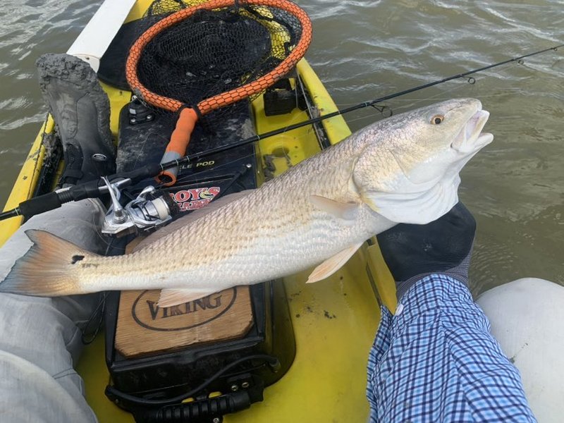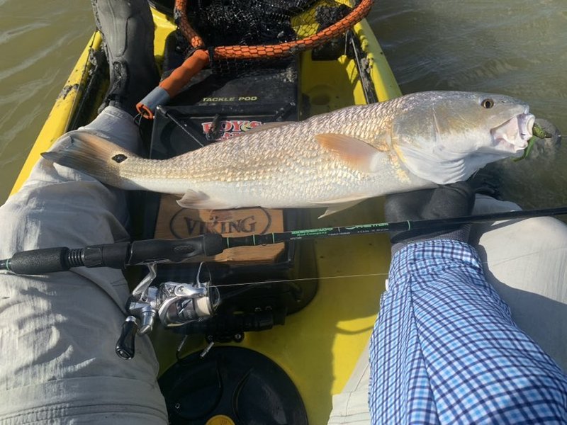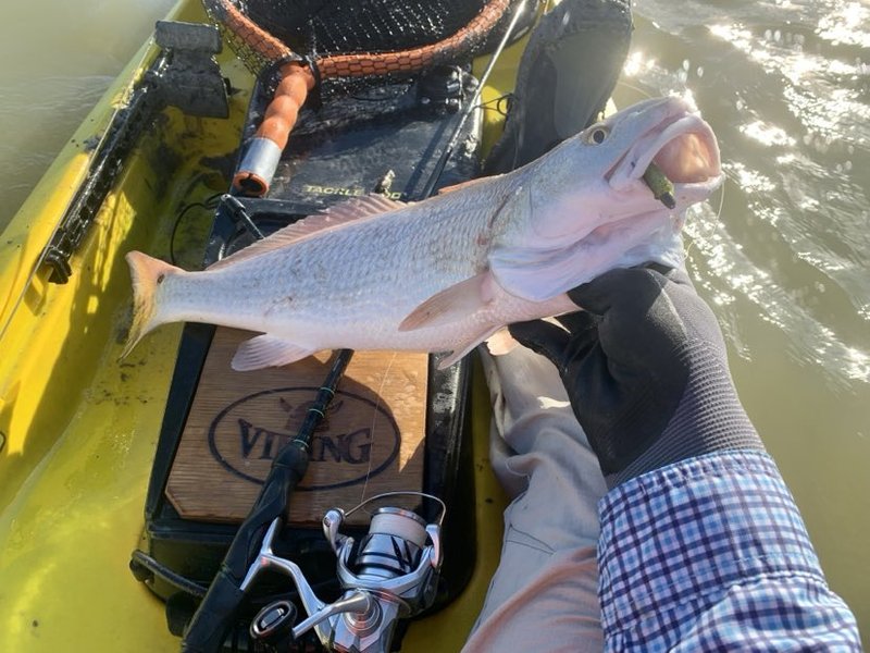 I had obligations that kept me off the water during the calm morning hours, but the afternoon schedule was open so I went looking for fish. The weather forecast was for 10-11mph winds from ENE and I knew which shorelines would be calm for that part of the tide. When I arrived shortly after the noon hour the wind was blowing about 15mph and it steadily increased over the afternoon. I don't usually let windy conditions prevent me from fishing (especially if it's my only chance to get on the water) so I paddled off hoping for opportunities. A mile from the truck I got my first shot at a few reds working quickly down a shoreline. It took a couple of casts in the wind to get the bait where it needed to be, but one of the fast moving reds saw it and responded. I boated the 22" fish and decided to put him on ice. Aware that it might be a tough day, I decided to keep any legal fish in hopes of taking home a limit of eaters. As I worked on into the marsh the wind slowly increased. By the time I got to the far side of the bay it was steady near 20mph. Still, some shorelines provided enough of a break to show hunting fish and I kept working along and finding them. This was one of those frustrating days that almost every possible bad thing happened ...several times. I broke fish off on the hookset (fishing 8lb braid doesn't leave any margin for error on your knots - lay the loops in a sloppy order and it will break itself when pressure is applied). When I tie on baits at home the knots are pretty and clean, but sometimes in the wind it's difficult to get the line to lay cleanly before cinching up a knot. I paid for that sloppiness twice on this trip. Three other fish managed to pull the hooks before I could get them into the net. Several schools were spotted after I was already very close, and the wind blew me into the fish before I could stop or present a bait to them. Add the frustration of the wind and you'd think I would have packed it in to wait for calmer conditions. This was the only chance for the weekend so I kept working. I did end up with a limit of nice reds, and then on the way out I found another school that was willing to part with one of its members long enough to get a photo. The last marsh area before portaging back into the river offered a gull hanging low over the water across a small berm. I worked to the spot where that berm opened up to my water and I put a foot down to wait for the fish to come into view. After a few seconds the fish had worked around to my side but they were still deep and unnoticed. Thankfully I was sitting at the ready, and when an oversized red jumped up onto the grass to slurp down a shrimp, the bait was immediately flicked that direction. It landed right in front of the red as it dropped back into the water and drew the expected response. The thump was hard and decisive, and the fish took a long drag-pulling run down the channel. Once the fish was turned, it ran back into the grass where we had started. Again I got the fish out and it ran back around the berm. I survived that issue and the fish ran down the other direction in the channel after crossing under the kayak. Still I held fast and kept pressure, thinking the fight was nearly over. As the fish calmed down the hook suddenly just popped free, and the fish swam away while I reeled in the bait. Crud.
