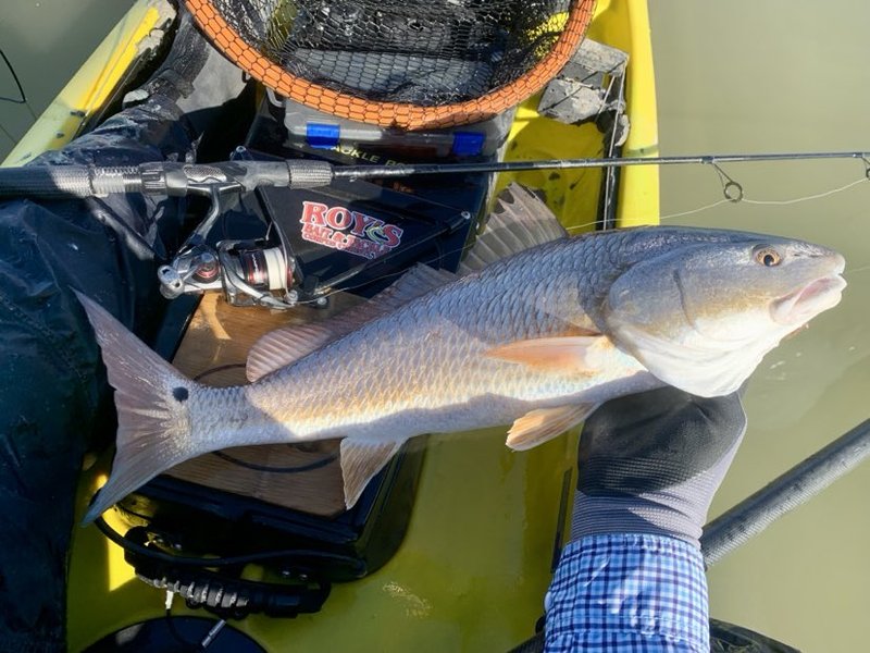 I looked ahead at more oysters exposed and saw what might be another fish. My movement was kept intentionally slow as I eased through the clear water. I could see all the details beneath the surface, and above the shoreline the morning sun was lighting me up and making me easy to spot for the fish. I took it slow and gently eased closer to the next small disturbance on the surface. It was a red, and I could see that he was mid-slot and busy searching in the mud for breakfast. I had to wait for the fish to get farther from me and turn away before I risked a cast. With such good visibility it was a lot like bow hunting from the ground where movements must be timed to avoid spooking the target. Once the fish faced away I gently placed the lure ahead of him and began to crawl it back. He pounced and ran around the kayak, creating a mud screen and heading for deeper water. He came aboard without problems and went into the fish-bag. I continued on quietly, checking every part of the oyster beds for possible fish. It took another 200 yards of searching before I saw a red's back lurch above the surface ahead, with a cattle egret walking beside and working to steal a shrimp or minnow from the redfish. Before I got into range the bird vacated the area, but the fish was unbothered. I got to where I hoped to intercept and after sitting for over a minute, the fish moved again and gave away his position. My first cast was ignored as it passed just ahead of the fish. Maybe he didn't see it or maybe he was paying attention to a different prey item. The second cast earned his attention, and he rocketed ahead and hit the bait. I felt the thump and waited for half a second before setting the hook. This one was hooked well and as he fought we spooked a few other redfish out of the oysters. Oh well, sometimes catching one costs you a shot at others.