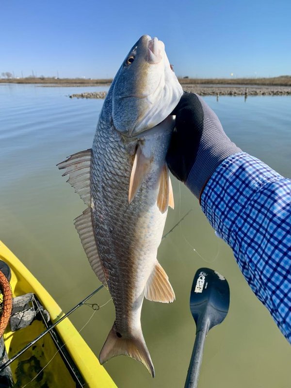 Saturday morning was chilly but the forecast showed it would warm up nicely once the sun came up. I decided not to make the long drive to see if white bass were in the shallows yet (they are one of my favorite Spring fish, but when the mornings are cold they don't spend too much time in the shallow water where I can find them with a fly rod). Instead of heading for fresh water, I decided to venture over to Copano bay to see if reds were in the shallows. This time of year the grasses have thinned out and tides are really low, but with morning being high tide, I figured it was worth running out to see what was happening. I arrived well before daylight with the intention of paddling across open water to check out some favorite shallow areas. Half a mile from the truck I questioned whether I had locked it up, so I turned around to ensure it was secure. Once I confirmed that yes the truck was locked, I began to paddle again, but with daylight coming on I stayed close to shore to watch for activity. It was still dark enough that looking away from the sunrise I couldn't see fish, but as I quietly moved along I heard a swirl behind me against the shore. The early daylight lit up enough for me to see the wakes of a group of reds that had gone past me unnoticed the first time. I turned the kayak to close the distance, and as I got close enough to get the bait ahead I let it fly. The 1/15 ounce weedless jig-head and Z-man Trick Shot lure sailed out and landed 6 feet ahead of the visible wakes ...but the fish were in a spooky mood and immediately scattered in all directions and stopped to assess the situation. With no more wakes to help me locate them, I realized it was just a matter of time before I spooked the already uneasy group, so I continued quietly in the original direction to check the flats. I figured maybe this school would be found by someone else who launched after me and they could have a shot at them.