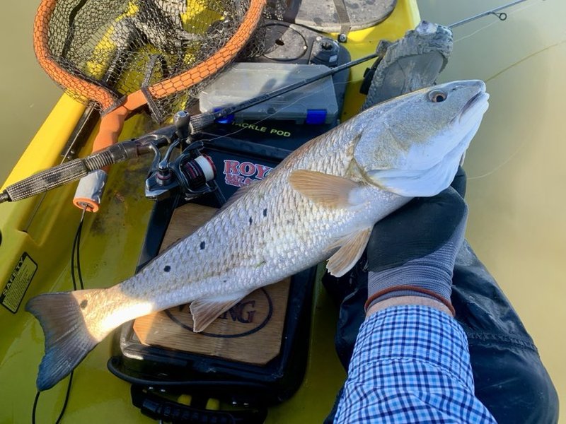 After the second fish was on ice, I continued the rest of the oysters without more contacts. Now it was either head for the truck or circle back around to work all the oysters again. I circled around for a second try, knowing the odds were less favorable but that it was still my best chance of finding one more fish. As I crossed the open knee-deep bay, I disturbed several schools of larger reds, and their wakes were easily visible. I made one or two half-hearted casts but spooked fish aren't what I wanted to catch, so I continued on to the beginning of the oyster zone. This time around it was quieter, but in one stretch of shell that had no signs the first time through, I found a single feeding fish heading my way. I waited with a foot holding me still, and the next time I got a visual the fish was already past me but within range. I placed the bait ahead and just inside the oyster shells showing above the water. A gentle hop allowed the bait to vault the oyster shell and it began to crawl towards me. The fish finally took notice and suddenly my only worry was keeping him buttoned until the net brought him safely into the kayak. I ended the morning with 11 miles paddled and three mid-slot fish aboard, but given the tricky conditions I was happy just to have a few fish.