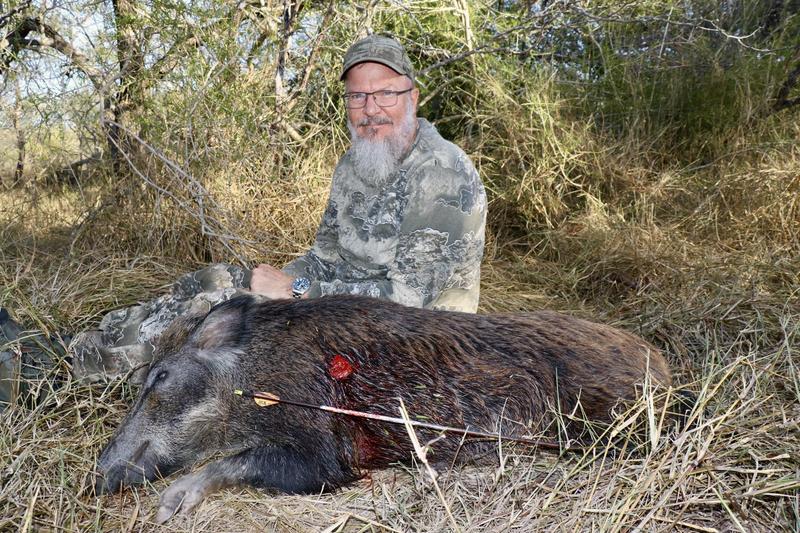 ...and that's okay, but there is a price to pay for such behavior. I had one of the cull bucks coming in, a 4.5 year old tank with a big gray flat top and small 6 point rack, but he hung up and melted back into the brush when he spotted pigs approaching. A double-lung shot at just under 20 yards sent her scurrying in a big circle through the brush, and she fell within 60 yards. The price for running off my target deer? Just five pounds of pork chops and two large hams. We are all square now, so no hard feelings.