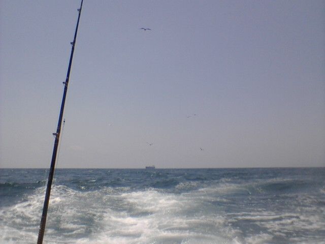 Frigatebirds? | Thanks, yes "Frigatebirds." They were working balls of one inch red minnows, near the north end of the anchorage on Saturday. I had seen a couple large "Spinners" free jumping as we were running and when we stopped there were large sharks and a lone "Battle Jack" cruising through the minnows we were on. There were so many minnows, in some areas the water turned red. The first group of swirling minnows we stopped on, a couple of guys on the charter and I watched a huge shark eat the no weight cigar minnow I had just tossed into the water. The reel was still in freespool and I got my first line burn, this year, while thumbing the spool as I was trying to throw that old Penn 309 into gear. I finally did and the fight was on. After several minutes we got another glimpse of the fish. It was a dang "King." I guess that king ran right under that shark and stole the bait literally "Right out from under his nose!" We were both surprised and disappointed even though this king was twice as big as any we had caught that morning on the ships.  |