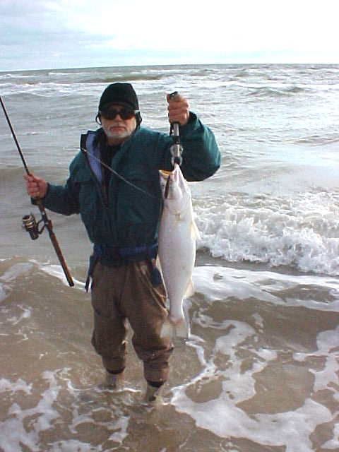 This is what I am talking about. We were fishing in early January of 2002 on a cold day and I saw Billy toss into what we would normally consider water too shallow to hold trout during the winter in the surf. I looked over and thought Billy had a nice fat redfish only to find out it was a fat trout. I think it was around 28.5 inches but it weighed 9lbs 4oz. I asked him "Why did you throw on that bar?" He said "Cuz I saw mullet jump!"