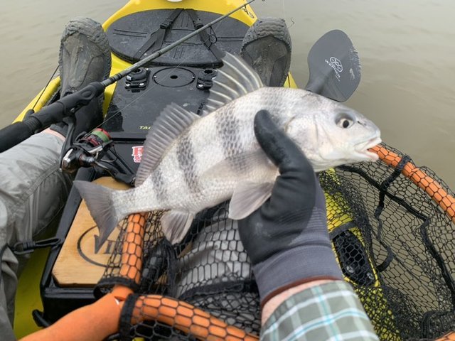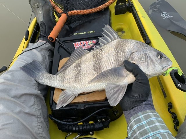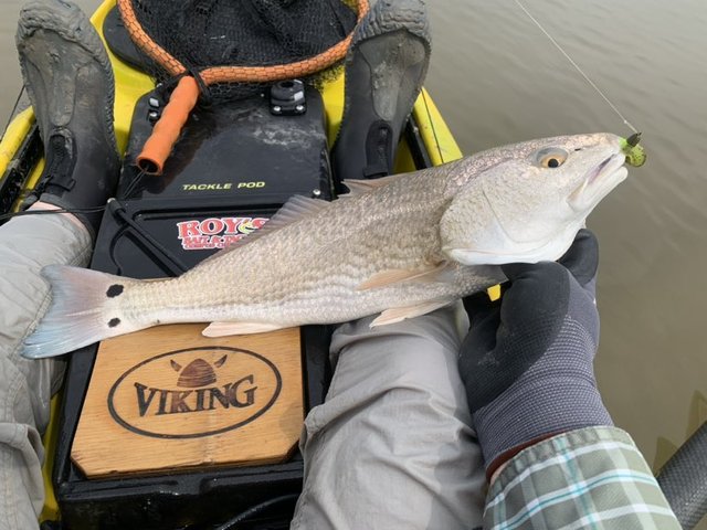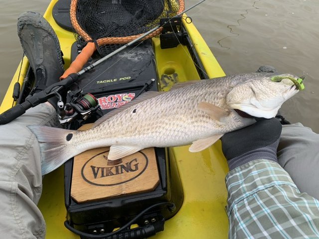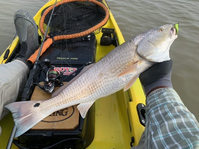 Saturday morning appeared to be pretty ideal conditions, and I was excited to be on the water. After a slow initial start I found a school of feeding drum, so I took my time sneaking close and dragging lures past several of them. The fly rod and a redfish crack fly will usually fire up a feeding drum, but even that offering was rejected by multiple fish. I finally got one to bite on a Z-man lure, and put a first fish on ice. That one pretty much spooked the rest of the drum from that spot, so I kept moving in my search for more targets. I finally found the reds I was looking for at the very back (and very shallow) end of a lake. I had shots at more than 20 exposed redfish, but very few allowed me to get a lure to them without spooking. It was so shallow that the kayak was scraping the mud and making it really difficult to get close to the fish. I finally got a pair of nice keeper reds and released a low slot fish, always hoping for another larger one. Around a corner I saw a redfish swimming ahead and working away from me. There were multiple fish near it, and when I cast ahead of the red, a little drum grabbed the bait and alerted everyone else that something wasn't quite right. Oh well, I came home with enough fish for two dinners and put in just over ten miles, so it was a great way to begin the day.