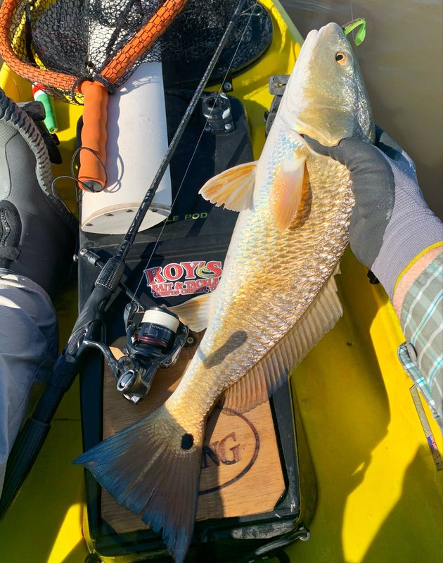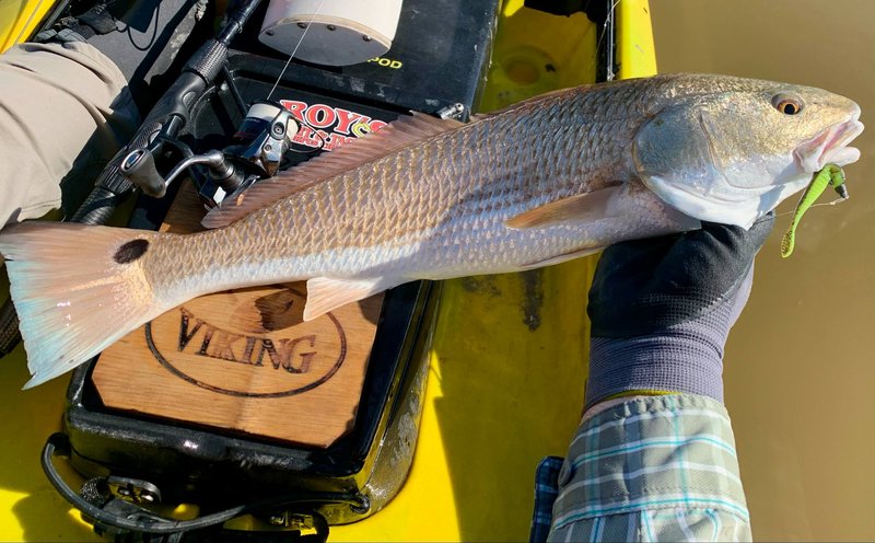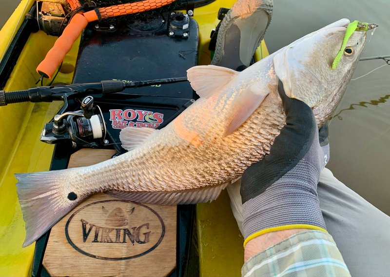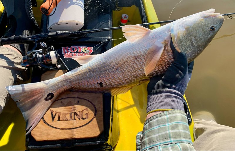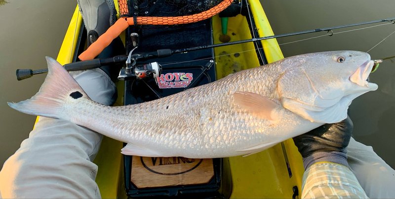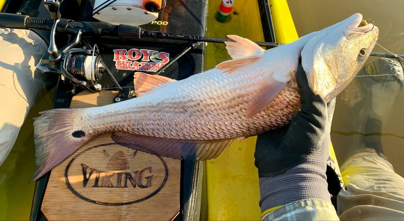 The first mile of the usual shoreline didn't show me any hungry reds, but when I paddled across to the other side things got more interesting. Large single fish were being sneaky but were cruising the mud edges and occasionally smashing bait along the bank. After a minute I was able to get the bait in front of one - and the big fish pointed out how the new Vanford has a nice sounding drag alert, as the fish tore out through open water and allowed the reel to sing the song of it's people. It's a small reel but very capable, and it maintained smooth pressure that wore the fish down. The red finally tired and I released the 30.5" fatty, as I was already eyeing the next potential fish farther down the shore. That one turned quiet as I approached so I kept working. At one spot the shoreline cut in as a small bar ditch angled back into the pasture. It was too small to paddle into, but I pitched the bait into the reeds right at the corner and got the attention of a solid red that had been trying to go unnoticed there. I had seen the dark shape just under the surface, and a gentle lure landing meant the fish was confident about crushing the bait. After landing that one I continued on with the search and by the time I checked my watch again it was after 9:30 - time to paddle for the truck. I got back to the truck by 10:15, filleted my catch and was headed home by 10:30. By 11:10 I was at the house so I washed and unloaded the kayak, set the cooler of fillets in the garage and changed clothes. Arrived at the college and walked into the meeting with ten minutes to spare and ready to start the work portion of the day. This evening I will get the fillets in the freezer before changing again for the first of six pinning ceremonies this week... at least I got in nine miles first and caught a few nice ones in the still conditions! Now the winds are returning and it's supposed to blow for a week. That worked out pretty well.