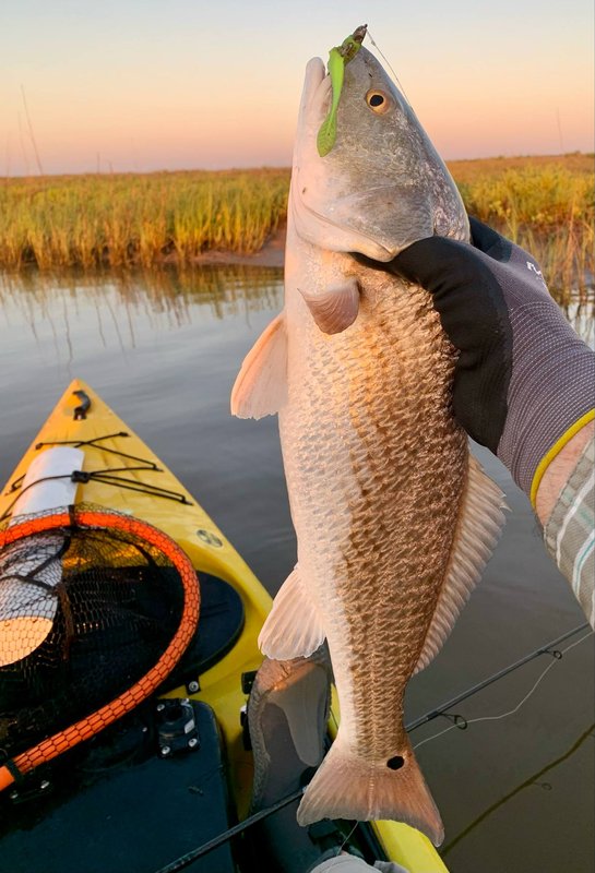 This morning winds were calm and the tide was bottomed out, just beginning to come back in. A few fish were quietly working shorelines, so I worked in earnest to find a bunch before I had to hurry back to work for a noon meeting. My fishing spot is a 35 mile commute from the house, so I was hunting with purpose at daylight looking for customers. I found a couple of mid-slot fish early on the usual shoreline and then tried a new area. I had planned to paddle back to the isolated lake that had rewarded me on Saturday, but now the water was too low for me to float the kayak back there. So I chose a small creek farther down the shoreline that ran back into a different field. There was a gator parked at the entrance, but it was under six feet and quietly submerged as I approached. A hundred yards into the grassy surroundings the creek split and I chose the left branch since I had already checked out the other side last week with little success. The left branch rewarded me with lots of fish to choose from; there were multiple singles and groups of reds spread out along the edges. One red that ate the little Trick Shot bait was a tank - 31 inches long and THICK. She splashed enough to spook all the other fish nearby, but I continued on and found others around the next bend that were receptive. The fish began to get less common, and after I spotted and kayaked around the next alligator of the morning, I decided to back out of the creek and go back to the open shorelines that usually have fewer giant lizards.