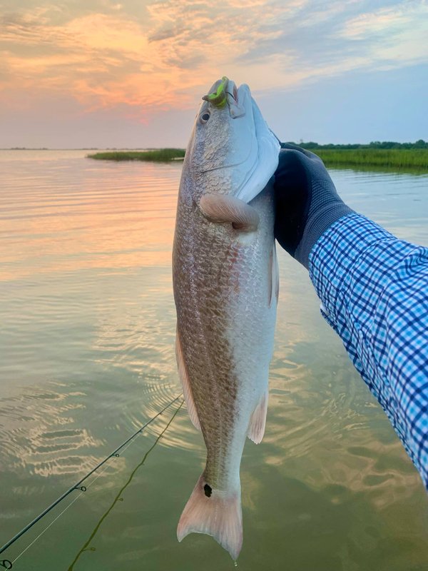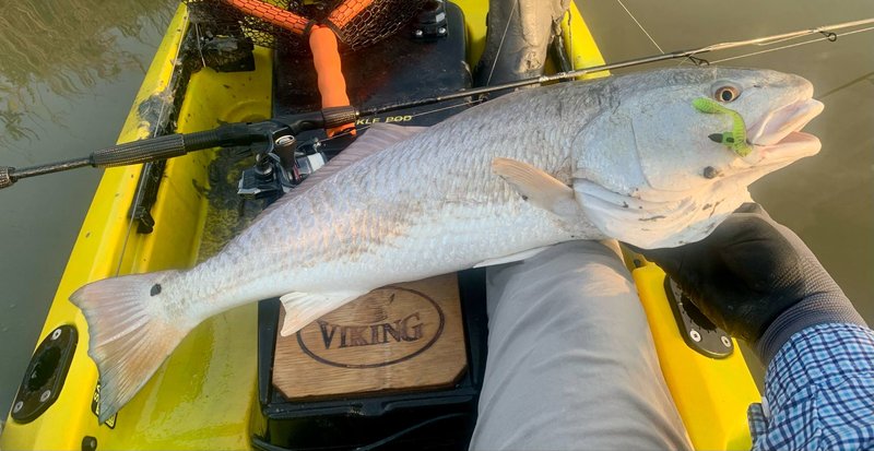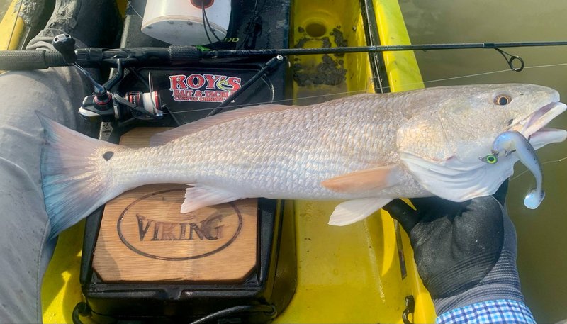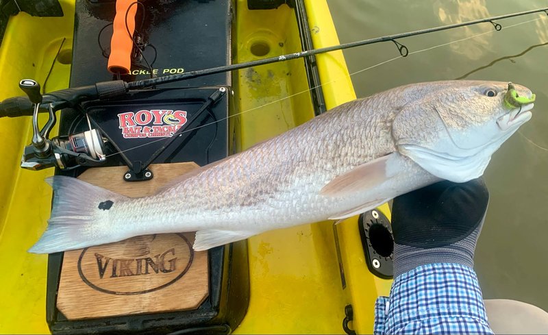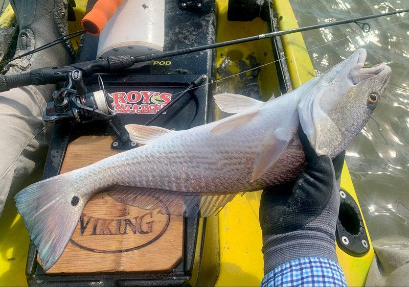 With college classes out this week, it should be a good time to take a morning off here and there to look for fish. I like the theory anyway, so I decided the low winds this morning warranted a morning trip to pick on the fish. I got to the launch a little later than usual and it was already light enough that I could load the gear without a headlight. One kayak was already on the water, and as I launched, he matched my direction. After a few hundred yards I turned to intercept the fisherman. We talked for a second and he stated that he was planning to work the same shoreline as me, so rather than compete for the same fish I gave it up and headed on back to the far lakes. On my way I checked the non-protected shore with no luck. As I turned into the cut leading back into the lakes, I spied a fish working the grass. He was trying to be sneaky, but the very tip-top of his pectoral fin was breaking the surface as he moved in stealth mode. It only took one cast to sell him on the idea of eating the lure. We were off to a good start as the 25" fish came aboard and went into the bag. I straightened the lure out and began paddling back farther. The first lake had a few smaller fish, but it was so shallow I could not scoot through very well, so I just powered through the mud to the entrance that lead to the second lake. Once in the slough it got much deeper again, so I went back to sneaky speed and slowly moved farther in. I spotted another fish working the same direction I was going, and I took my time quietly closing the distance. One cast again produced a loud slurping strike, but the fish missed the lure as it came flying back toward me. I gathered my dignity and reminded myself to give the fish more time to eat. The fish wasn't upset and just thought he missed a treat as he resumed hunting. A few paddle strokes got me back into position and this time I let the bait move slowly into the fish's view. The strike was on target, and we danced as the fish pulled drag and headed back toward the bay. For a minute I wondered if the little 1000 Vanford was up to the task, but the fish tired and slowed down like they usually do. I worked it in and released the 29" fish.