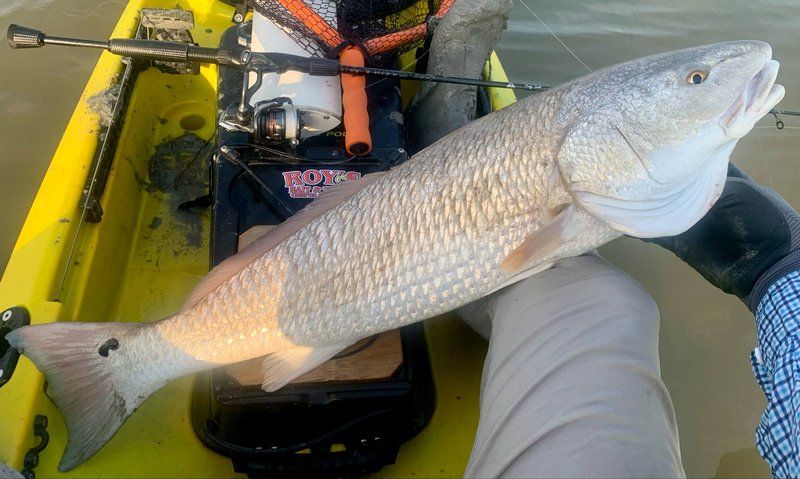 As I neared the lake, already I could see a group of tails out in the middle and working to my left. I paddled ahead of them and put the lure where they would see it. One steady pull of the lure gave them all the encouragement needed to get hooked up again, with mud and foam flying loudly into the air. The school broke into three smaller groups and all three slowed down making them hard to track. I got this fish in, and at 31" it was a tank destined for release. It took a while for the fish to get going, but it finally swam off nicely. By the time I was ready again there was another school not far away, and when I got closer it appeared to be smaller fish. I'm not one to turn down fish, so I put the bait out front and BANG another fish inhaled the lure. This one went 21" and was sent back with the hopes of finding larger ones. The lake got quiet as the fish all sat still for a minute to see if the yahoo on the kayak would leave them alone. My time was limited, so rather than sit and wait for the fish to feed again, I headed out to continue searching. As I got to the protected bay shoreline I saw the other fisherman working back toward another area. He had already been past, so I turned the kayak toward the truck to see if he missed any fish along the shore. I don't know if he had missed them, but there were some feeding fish here and there. One had the sneak thing down and barely showed a ripple as he worked the grass shoreline. The tiny ripple was moving like a redfish, so I put the lure out front and it got slammed. This one was a solid fish and after several runs right through oyster shells I finally got it to the kayak. I continued on, and at one spot as I paddled around a big blob of exposed oyster shell, my paddle came down right on a huge sleeping redfish right beside the kayak. He let out that tell-tale redfish drum of BRRP BRRP! as he left me with just a mud cloud and a smile. As I got closer to the truck I was worried I might not find a third fish to keep, but on the last few small sections of shoreline I found a couple of small reds. Several spooked but one at the lure right on cue and came aboard at 20.5". At that point I was not going to turn him down. I hurried back home, changed clothes and got to the office in time to take care of today's pressing matters and meetings. It never stops at work, but when I can sneak out and fish in the morning it's all good.